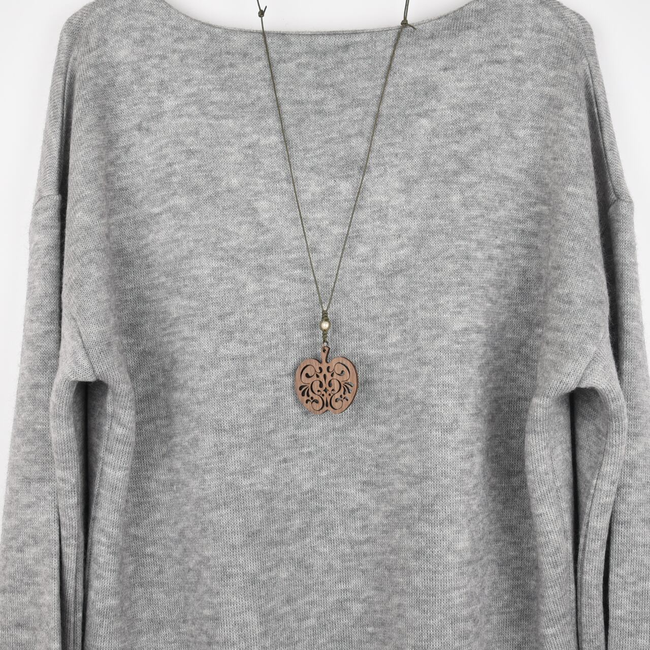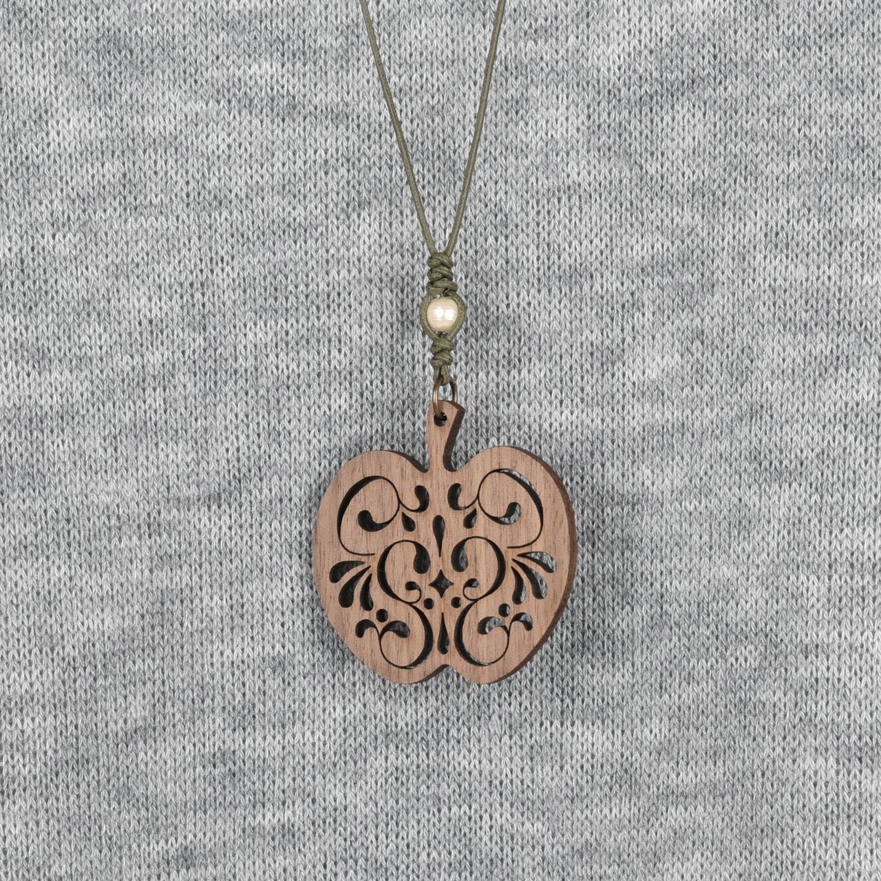生命のエナジーを秘めた林檎モチーフのウォールナットエレメントに、ホワイトクリーム色の優美なコットンパールを添えたエレガントなグリーンコード木製ネックレス。