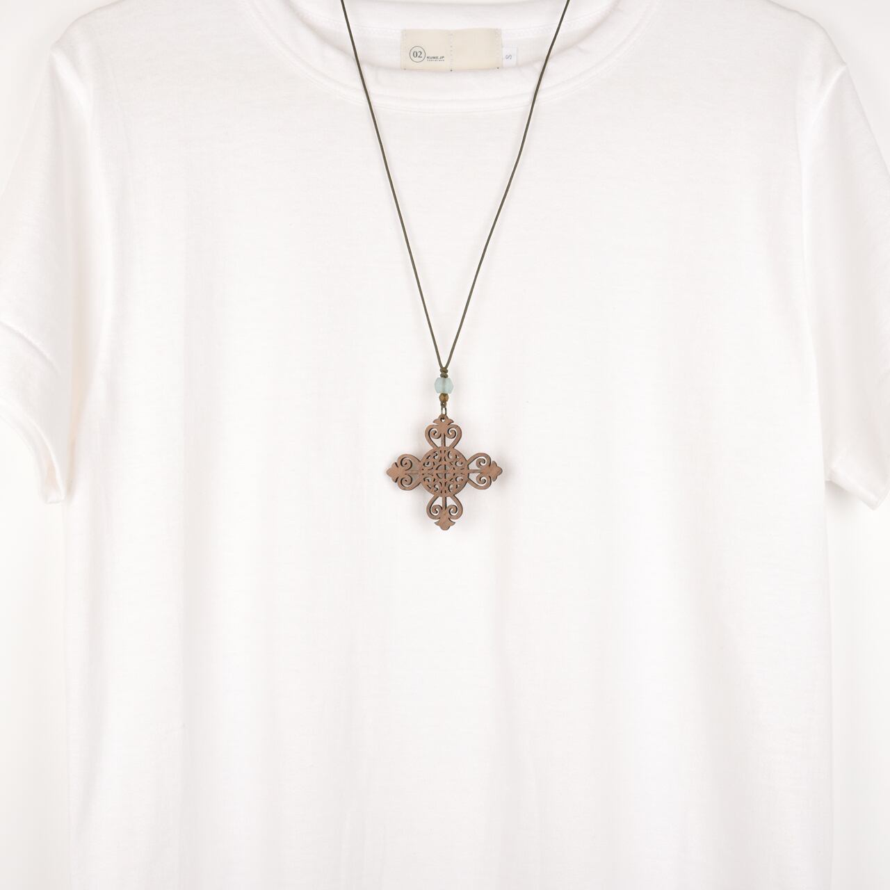 十字架のウォールナットエレメントに磨りガラスビーズが水色の輝きを添える、湖畔の教会をイメージしたボリューム感あるグリーンコード木製ネックレス。