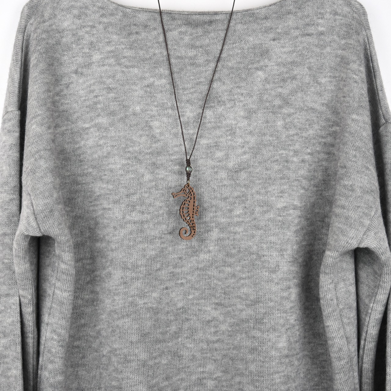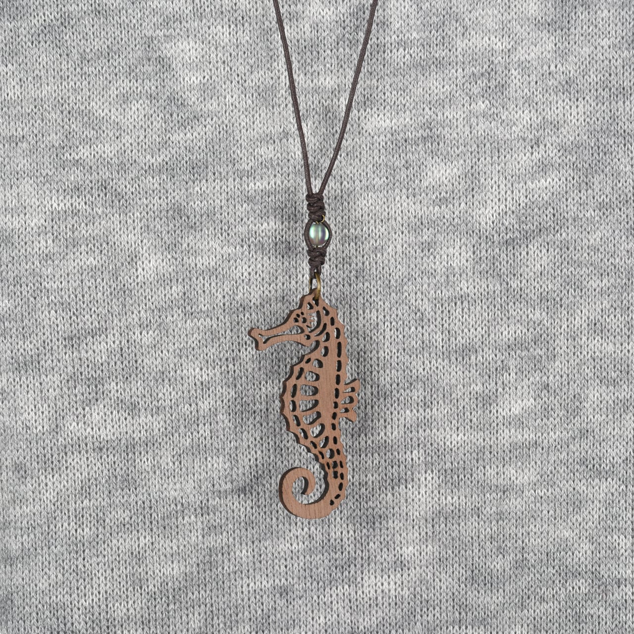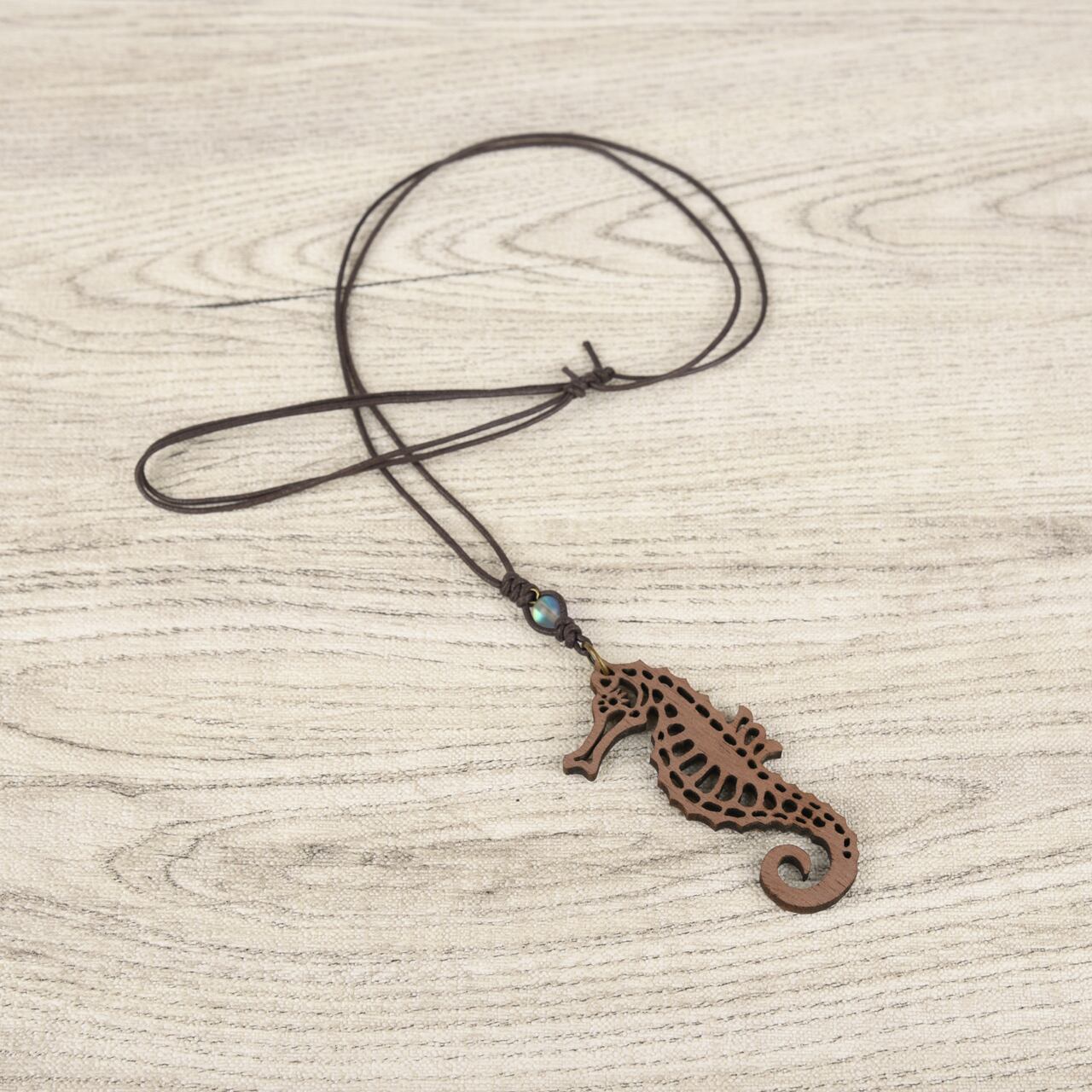 タツノオトシゴ(シーホース)のウォールナットエレメントに、海を思わせる幻想的な輝きのフラッシュビーズを添えた木製ネックレス。