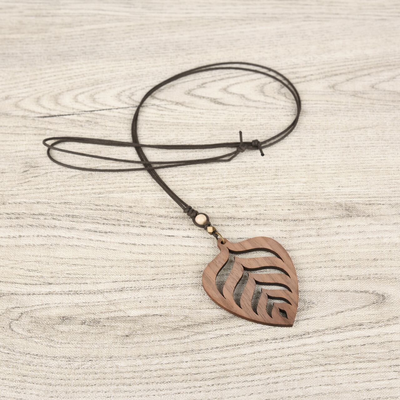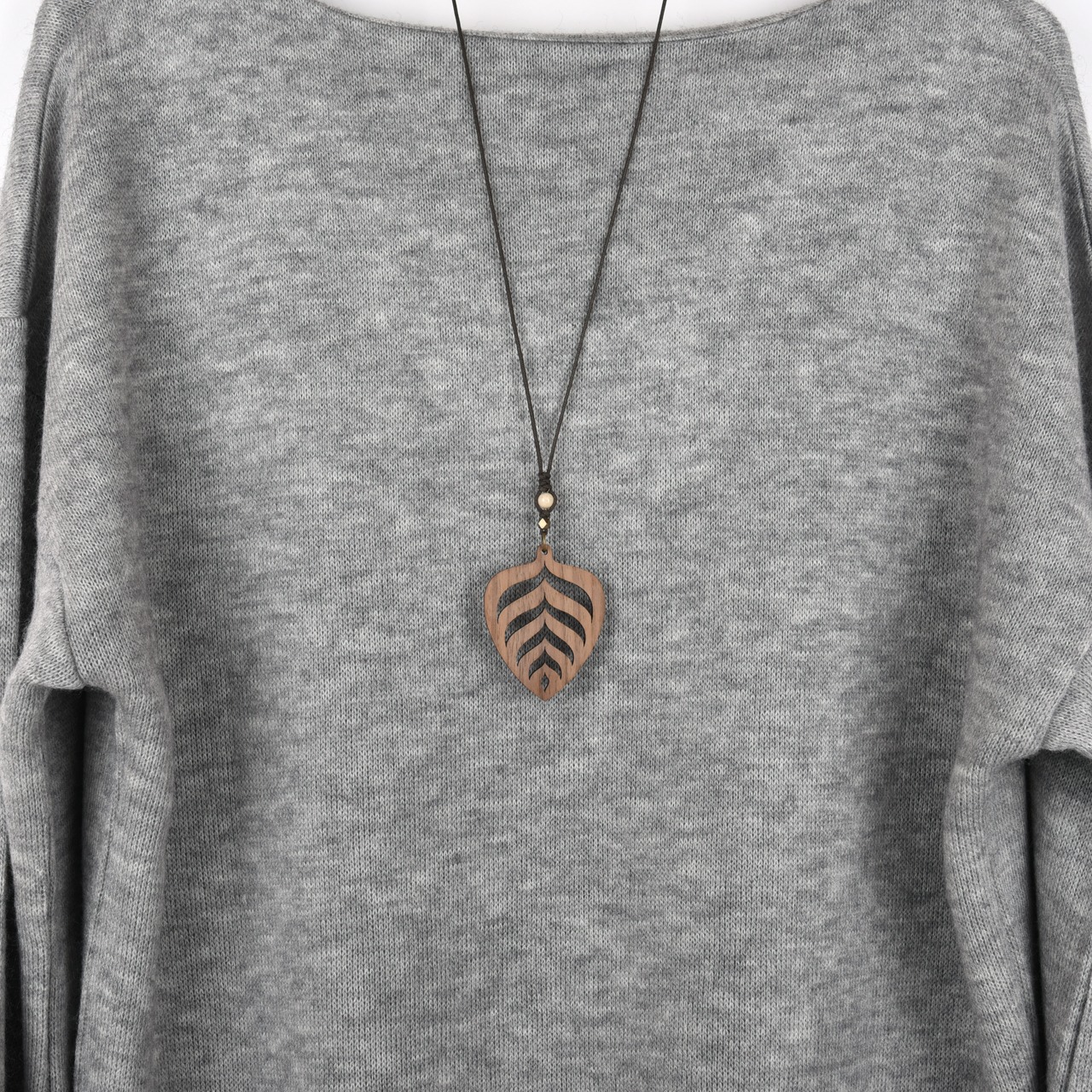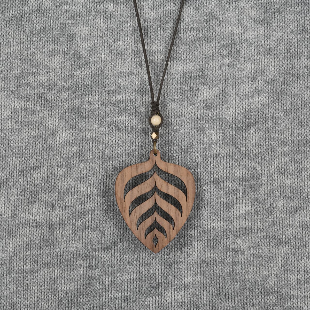 木の葉モチーフのウォールナットエレメントに、穏やかな乳白色が美しいリバーストーンの彩りを添えたネックレス。