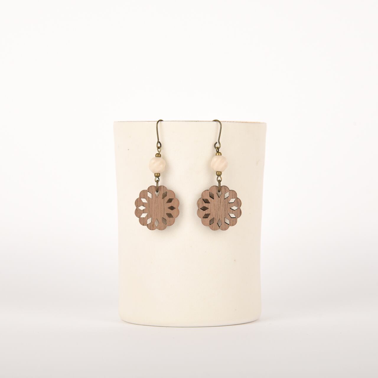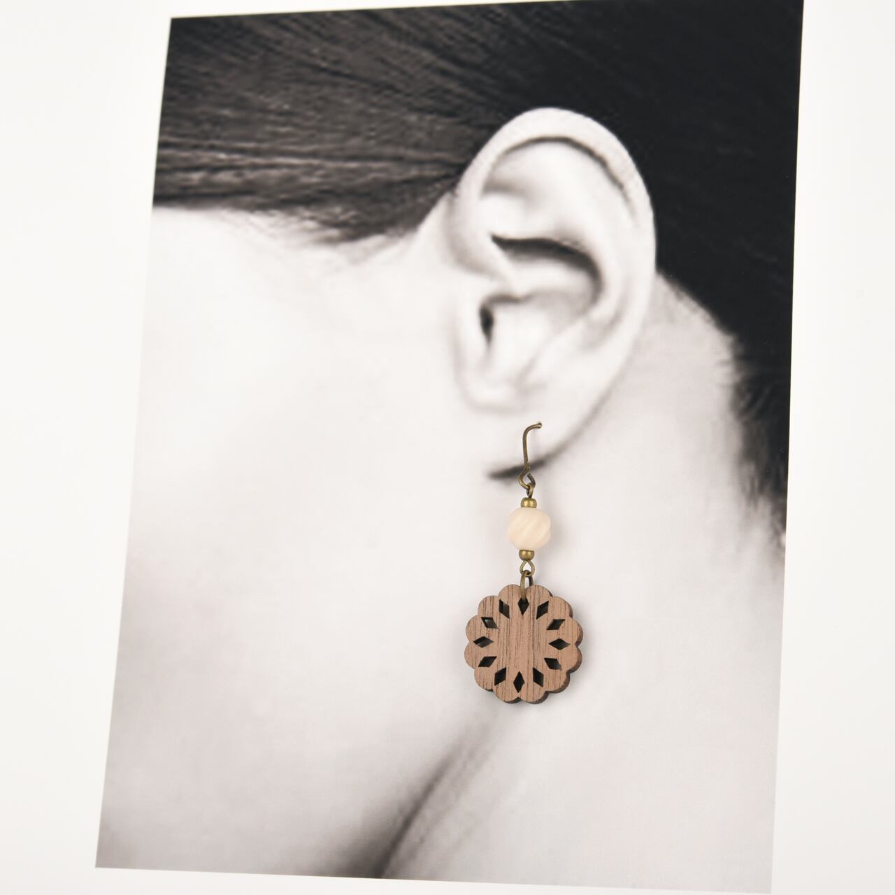 小さな花モチーフのウォールナットエレメントに、穏やかな乳白色が美しいツイストリバーストーンの彩りを添えた木製ピアス。