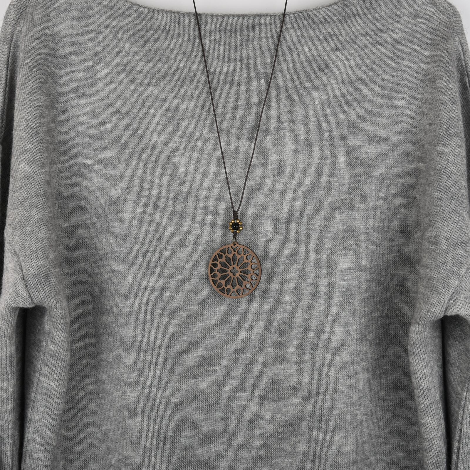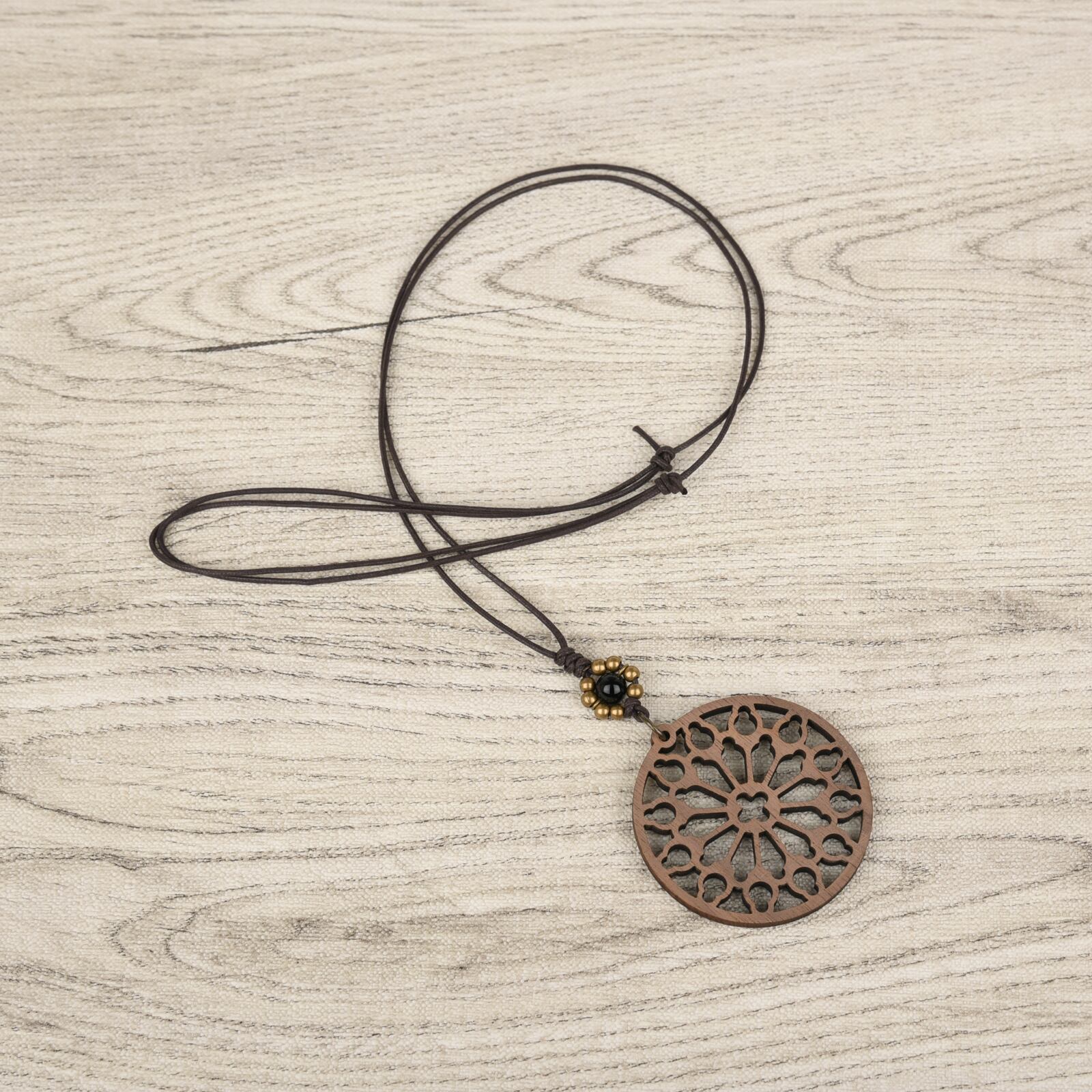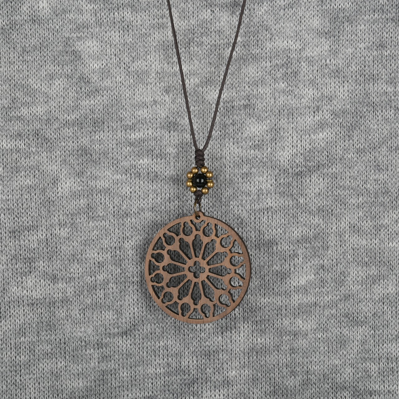 大聖堂の天窓モチーフのウォールナットエレメントに、艶やかな冷黒が美しいモリオンを添えたシックな木製ネックレス。