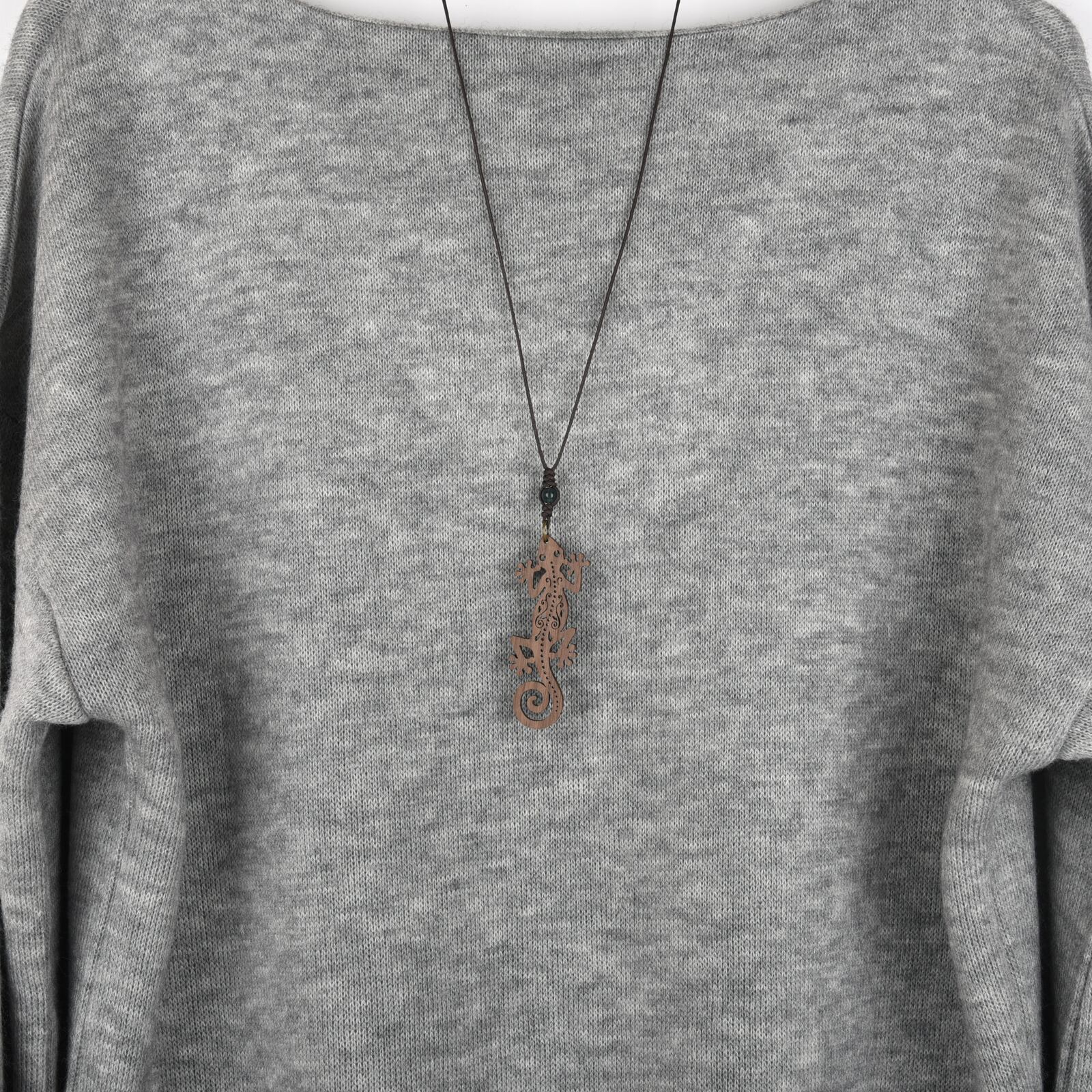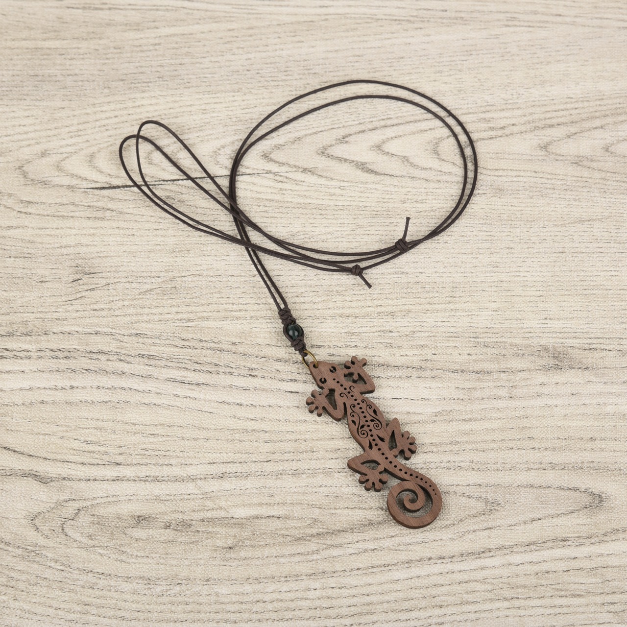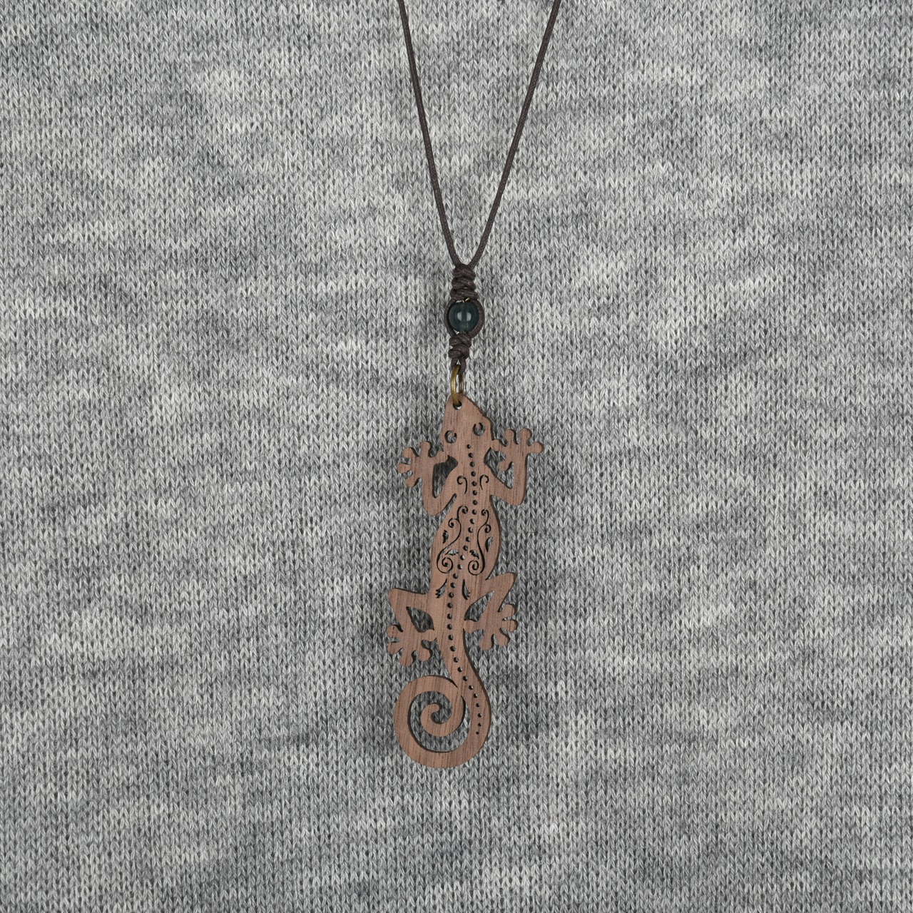 家の守り神・ヤモリのウォールナットエレメントに、チェコガラスのダークなブルーグリーンの彩りを添えた木製ネックレス。