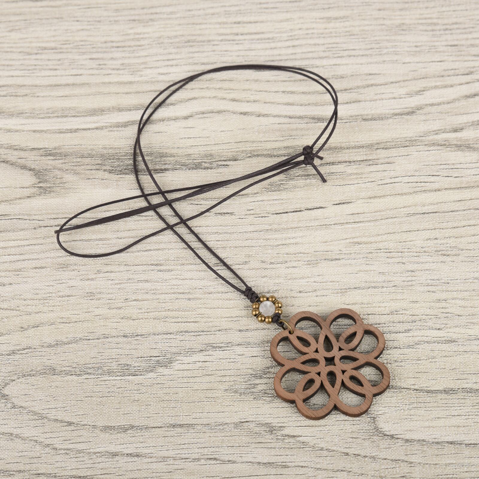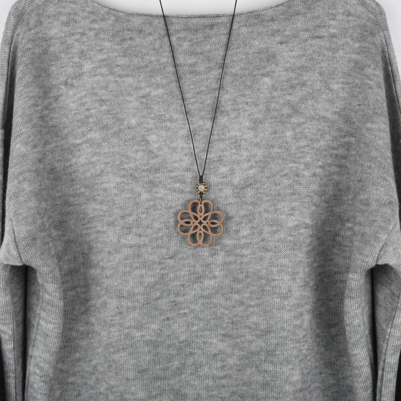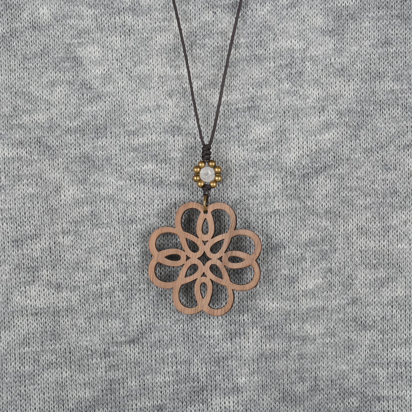 四つ葉のクローバーモチーフのウォールナットエレメントに、氷のようなフロストクリスタルを添えた、雪融けの高原に咲く花をイメージさせる「Edel Frost=高貴な氷」アレンジの木製ネックレス。