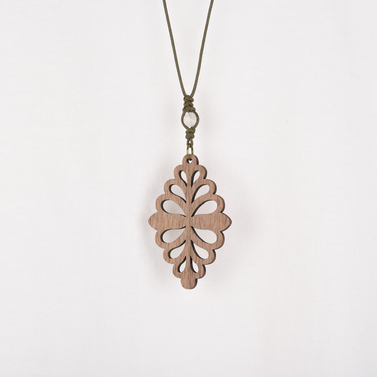 シダの葉(フォリアージュ)モチーフのウォールナットエレメントに、氷のようなフロストクリスタルを添えたシンプル&クールなグリーンコード木製ネックレス。