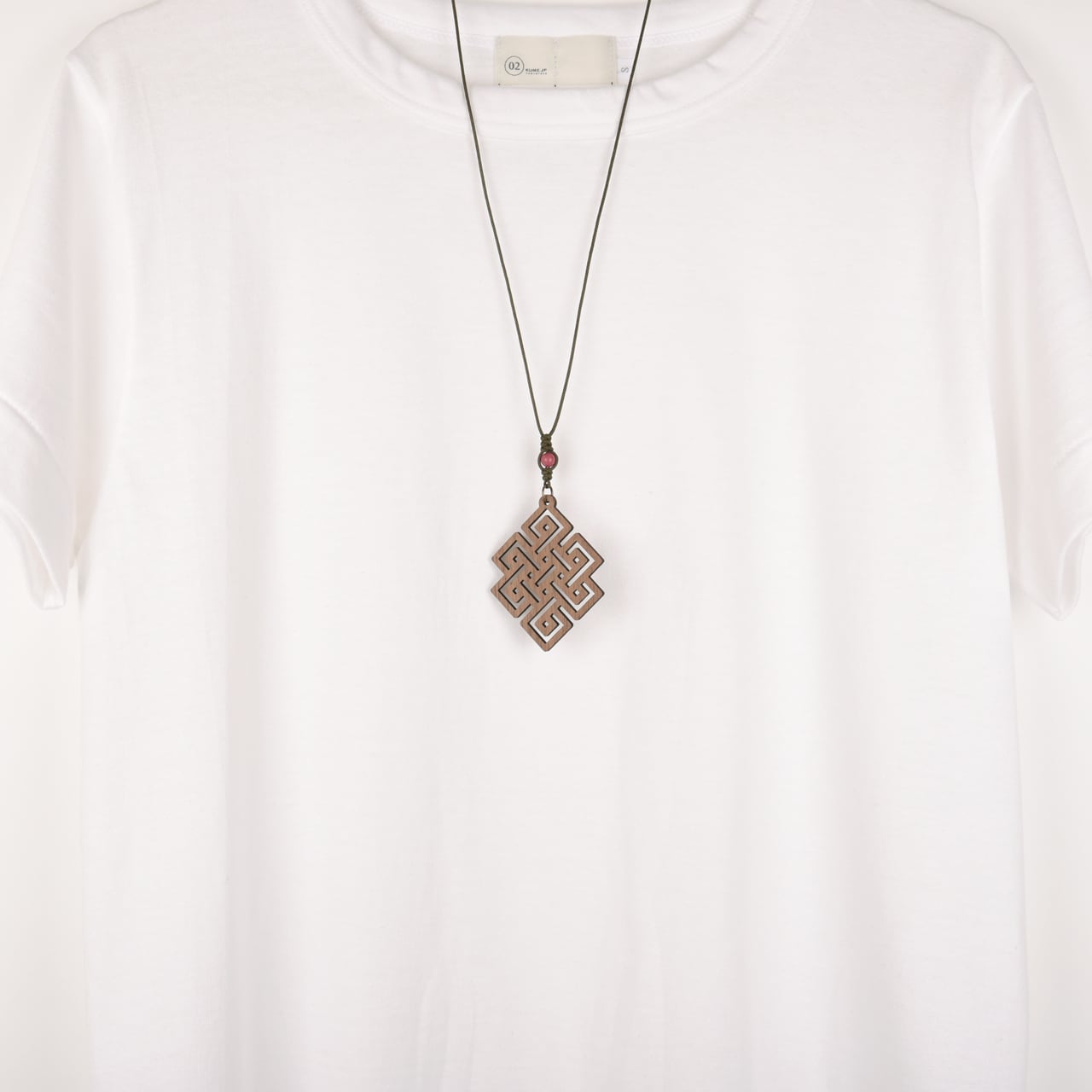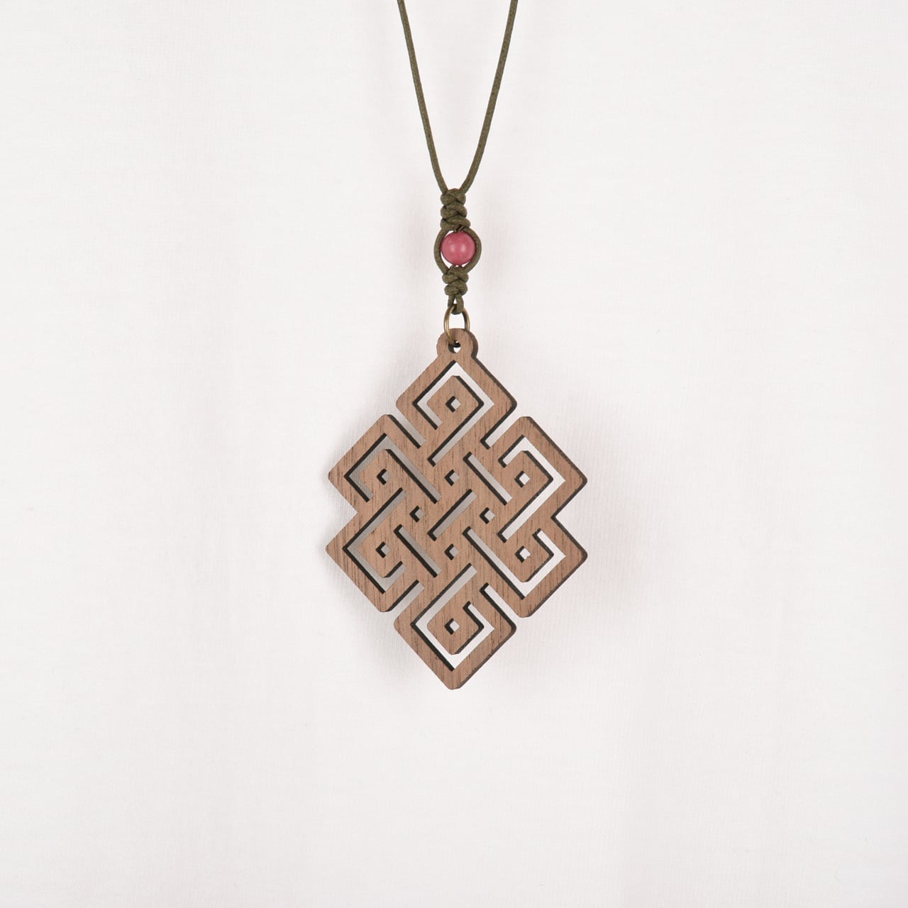 チベット仏教のシンボル「エンドレスノット」(宝結び)をモチーフにしたウォールナットエレメントに、ロードナイトのピンクカラーがアクセントを添えるエスニック&キュートなグリーンコード木製ネックレス。