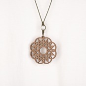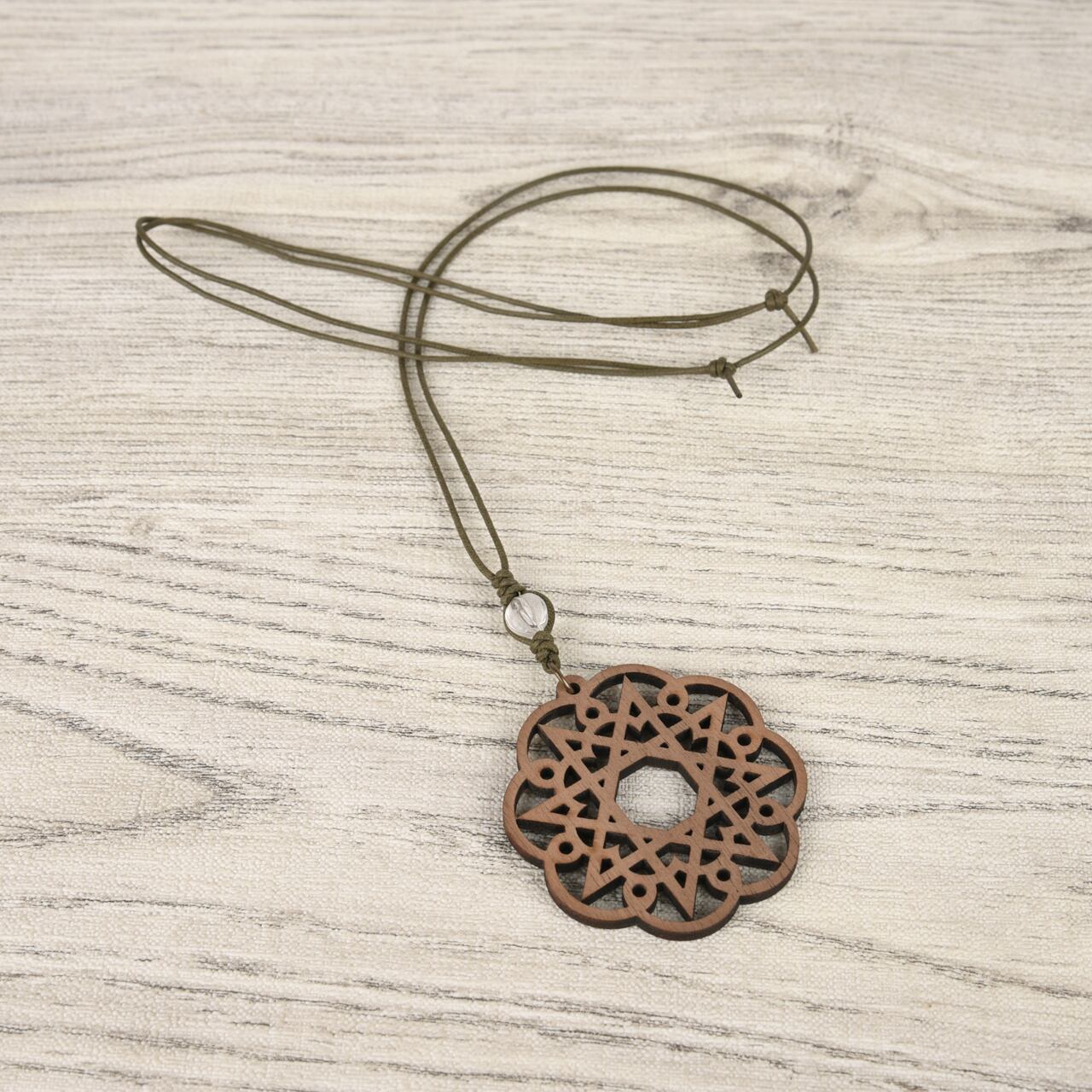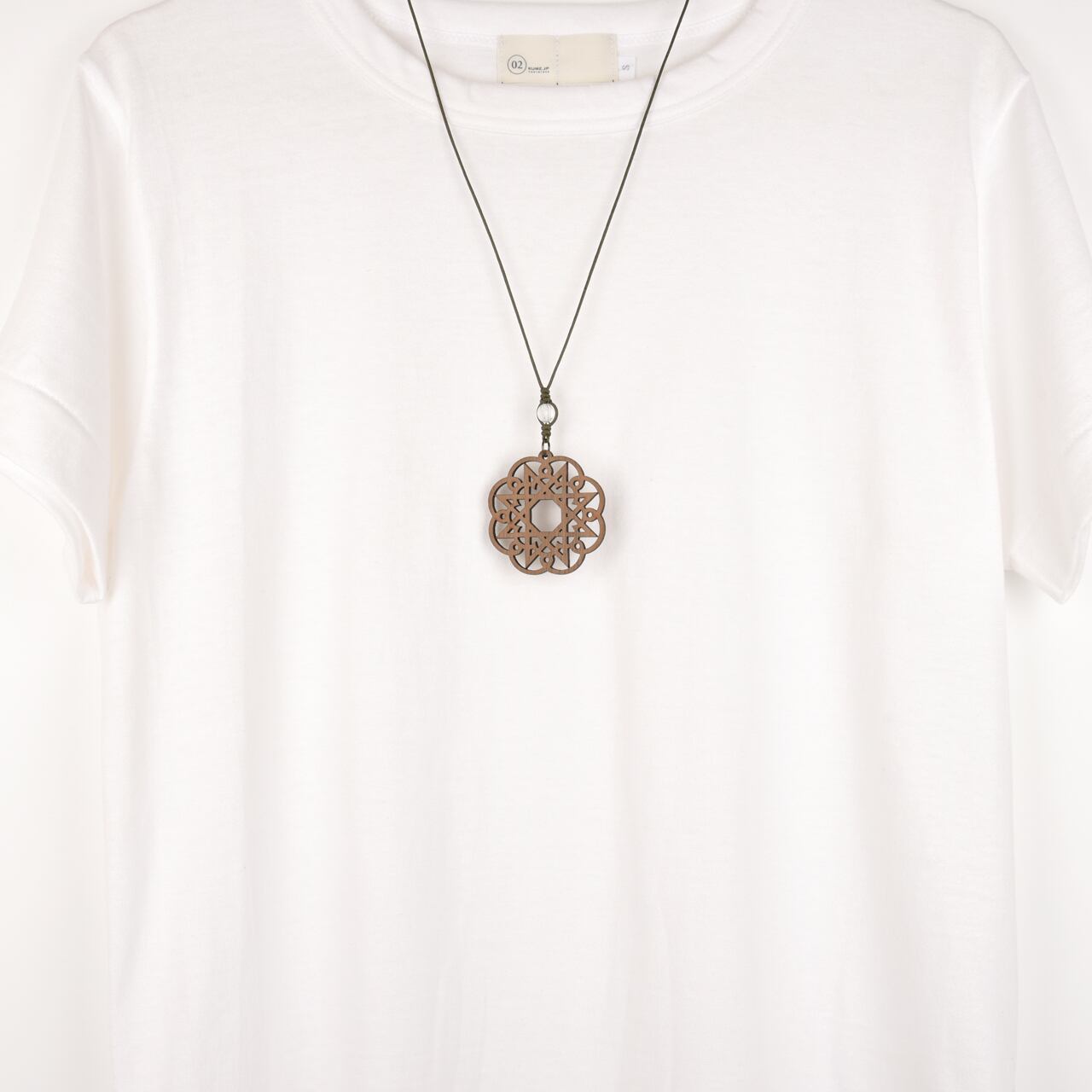 宇宙の原理を象徴するアラベスク(幾何学模様)モチーフのウォールナットエレメントに、優美なツイストクリスタルを合わせたグリーンコード木製ネックレス。