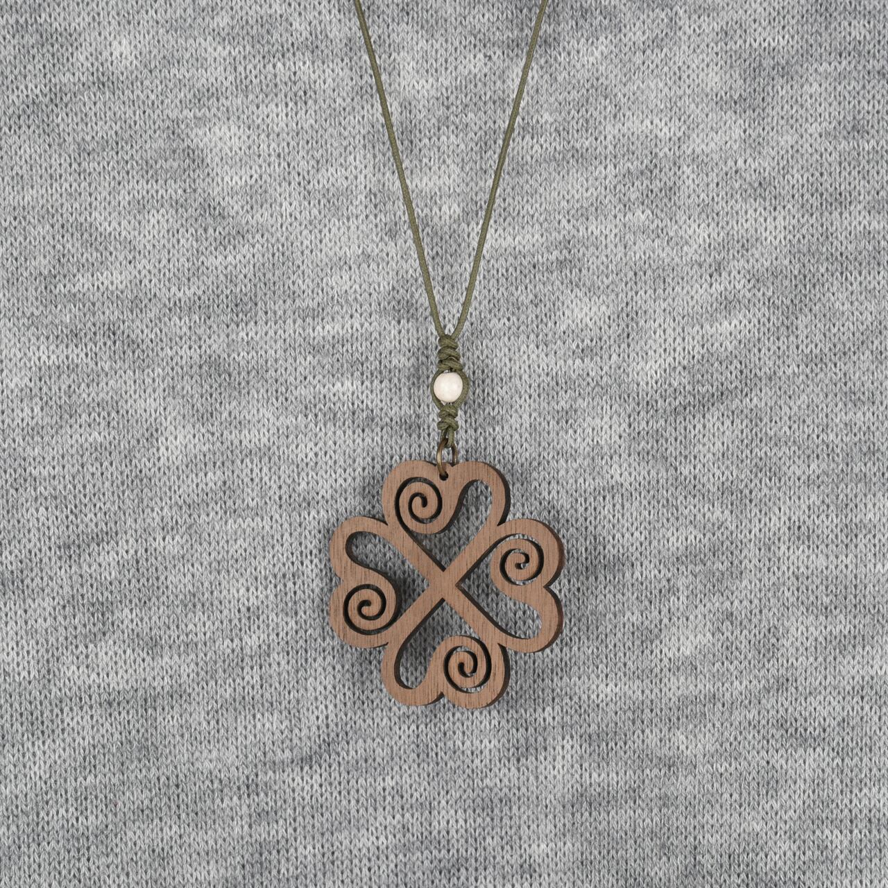 四つ葉のクローバーモチーフのウォールナットエレメントに、艶やかなリバーストーンのホワイトを添えたグリーンコード木製ネックレス。